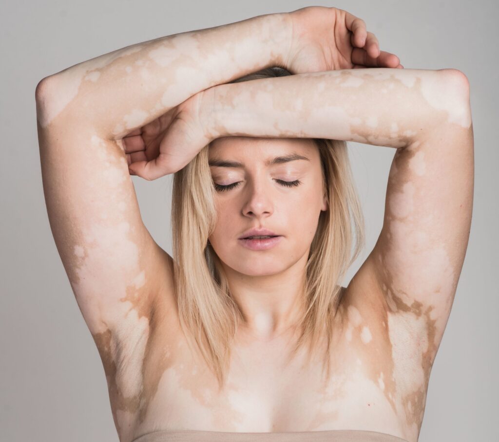 Matyt dėl tų pačių žmonių žvilgsnių. Juk tokie žmonės kaip aš nerodomi per televiziją, jų nematyti ant žurnalų viršelių (dabar situacija keičiasi ir yra pasaulyje pavyzdžių, bet ne Lietuvoje), čia tas sukurtas idealios figūros, idealios odos kultas… O aš esu tokia truputėlį perfekcionistė. Todėl visada laikiausi nuostatos, kad kam rodyti, kai kažkas nėra tobula, jei galima paslėpti. Todėl visada nešiojau tik „pilną maudymuką“ (čia niekas nepasikeitė ir nesikeis 🙂 ), ant jo vilkdavausi sijoną, nes kirkšnyse yra didelės baltos dėmės – norėjosi jas slėpti. Niekada nenešioju palaidinių ar suknelių su petnešomis, visada renkuosi bent su minimaliomis rankovėmis, kad nesimatytų dėmės pažastyse, vasarą (net karščiausią dieną) lįsdavau į pėdkelnes, tiesa, tik tada kai eidavau į darbą, laisvalaikiu ne, bet to jau neliko.