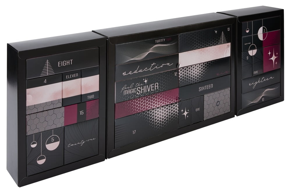 Užkurti aistrą santykiuose dar niekada nebuvo taip paprasta. 24 dėžutės su įvairiomis erotinėmis dovanomis – nuo aukštos kokybės sekso žaislų iki stimuliuojančių gelių ir švelnių masažo aliejų. Rinkinį sudaro 24 erotinės prekės, kurių bendra vertė – virš 600 eurų.