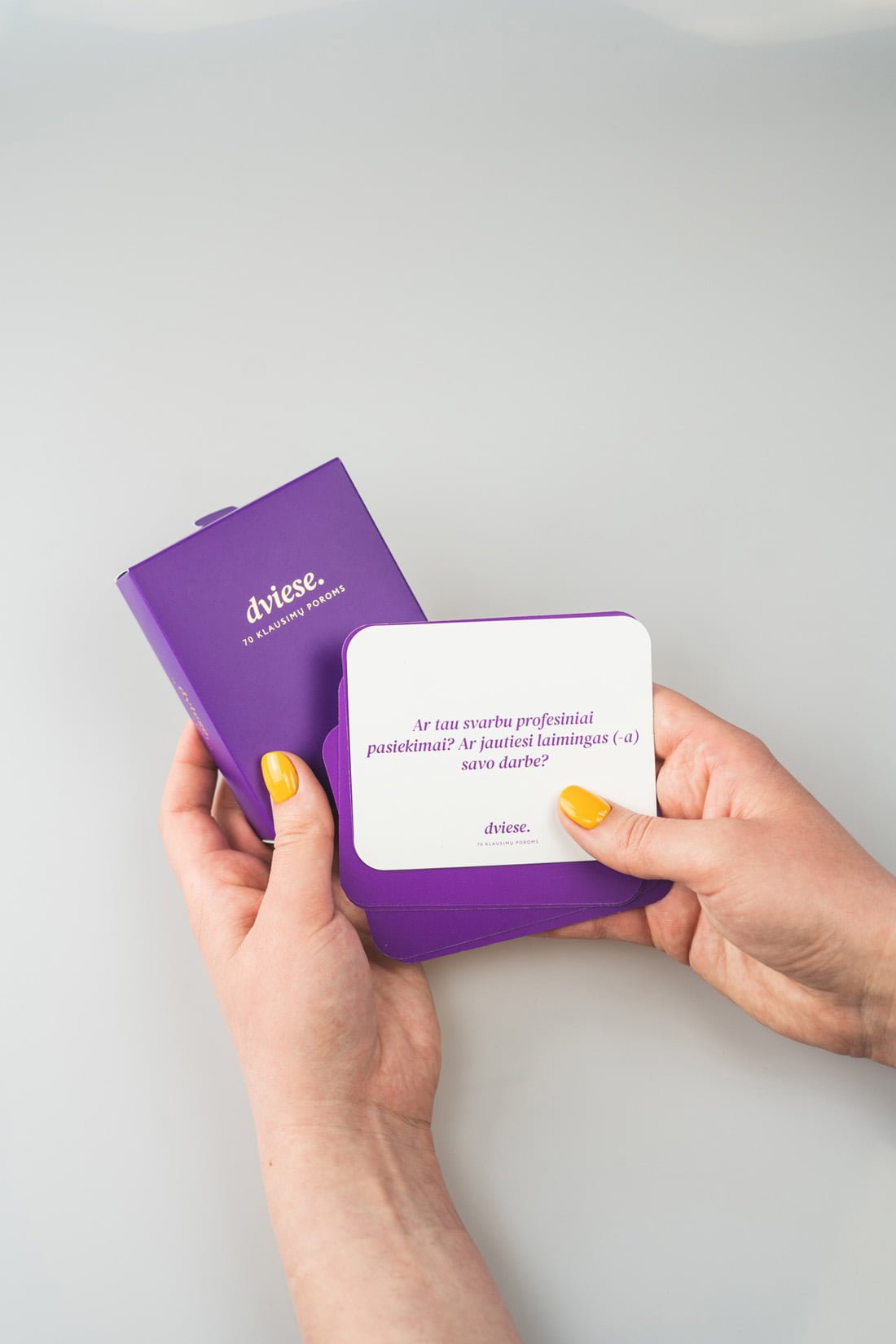 Santykių kortos „Dviese“ skirtos poroms, kurios žino, kad gražūs santykiai yra kuriami bendrų pastangų dėka, o nuoširdūs ir gilūs pokalbiai – raktas į santykių sėkmę. Kortose pateikti klausimai tiks ir tiems, kurie skaičiuoja ne pirmą dešimtmetį kartu, ir tiems, kurie dar tik susipažįsta.